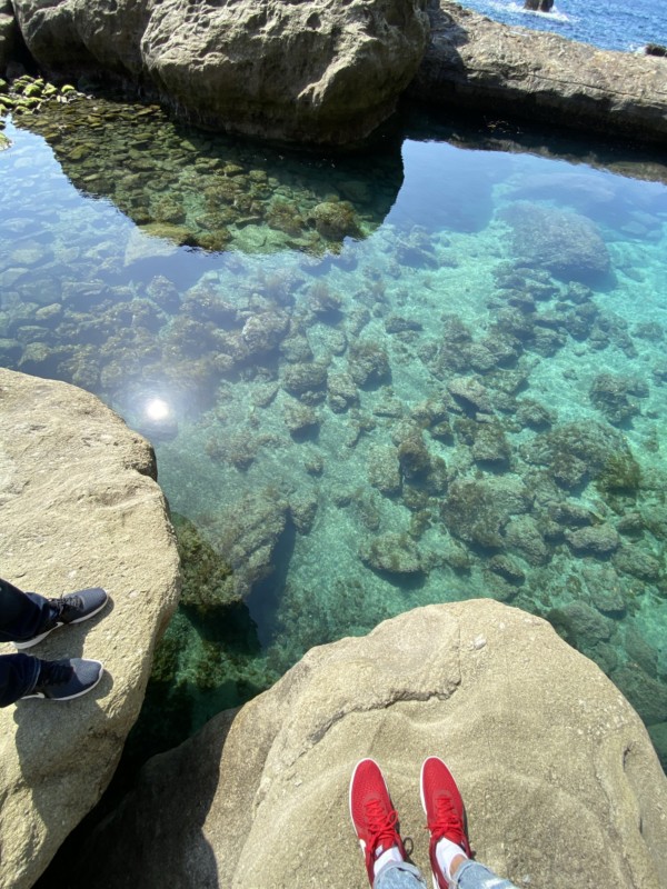 黒い溶岩の上から見る青い海